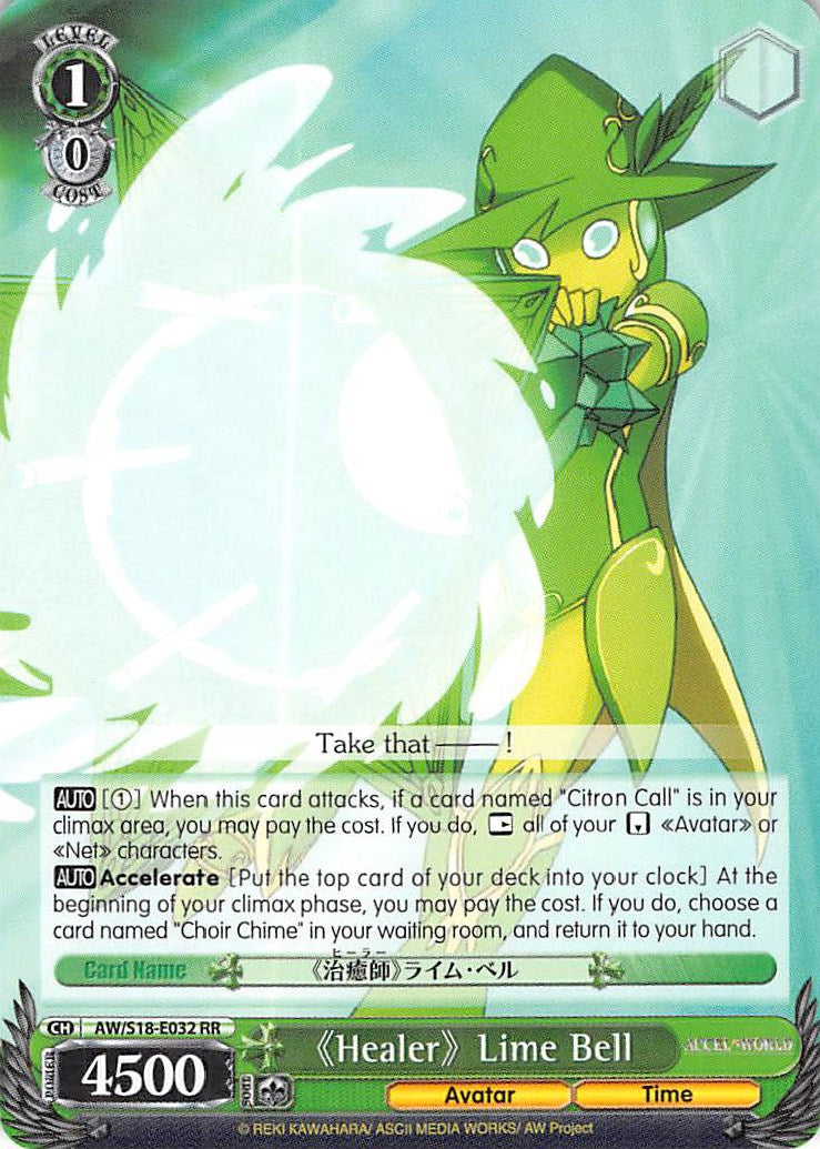 "Healer" Lime Bell (AW/S18-E032 RR) [Accel World]$0.60Release Date: 2017-05-24 Set Name: Accel World Card Number: AW/S18-E032 RR R...