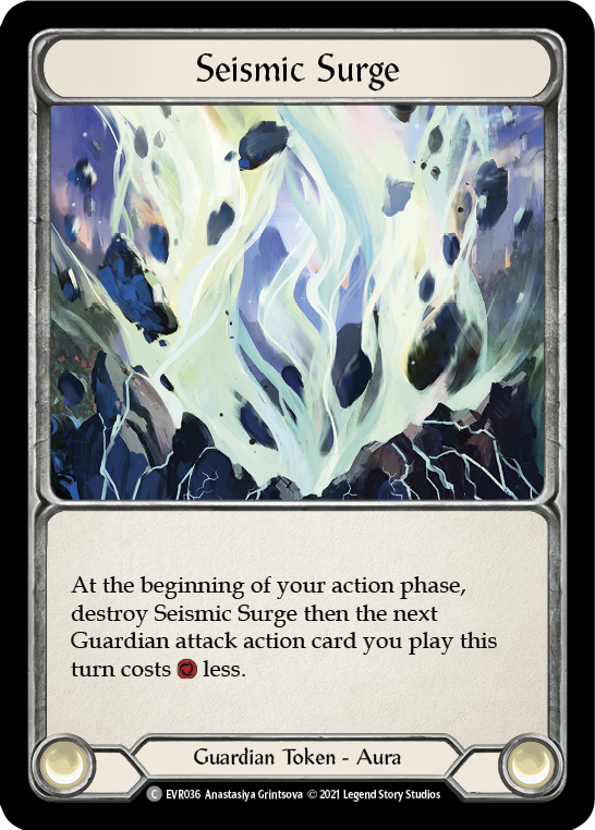 Near Mint 1st Edition Normal5 Low stockLightly Played 1st Edition Normal0 Out of stockModerately Played 1st Edition Normal0 Out of stockHeavily Played 1st Edition Normal0 Out of stockDamaged 1st Edition Normal0 Out of stockSet: Everfest Edition: 1st Edition Finish: Regular Type: Token Subtype: Aura Rarity: Common Class: Guardian At the beginning of your action phase, destroy Seismic Surge then the next Guardian attack action card you play this turn cost [Resource] less.We have a 30-day return policy, which means you have 30 days after receiving your item to request a return.